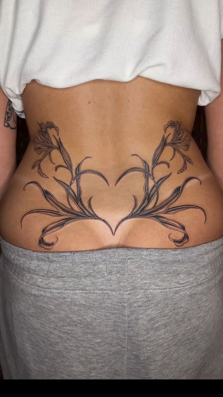 This design feels like pure movement. The mirrored floral elements stretch across the lower back and hips in a way that makes the whole body look more fluid, more graceful, almost dancer-like. I love tattoos like this because they don’t just sit on the skin—they follow it. The result is romantic, artistic, and undeniably flattering, especially if you want something that feels lighter than a fully centered piece. It has that airy elegance many women want from lower back tattoo ideas, where the tattoo feels sensual and feminine without becoming too heavy or too serious.