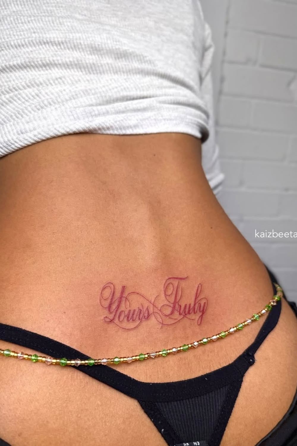 This one has a completely different energy, and I mean that in the best way. The soft Red script feels playful, flirty, and just unexpected enough to stand out from all the usual black ink. It has a light, fashiony attitude that makes the lower back placement feel fresh again, especially if you like tattoos that look a little more styled and a little less traditional. There’s something about colored script that feels youthful without being immature. It reads like confidence with a wink, which is honestly a pretty fabulous combo.