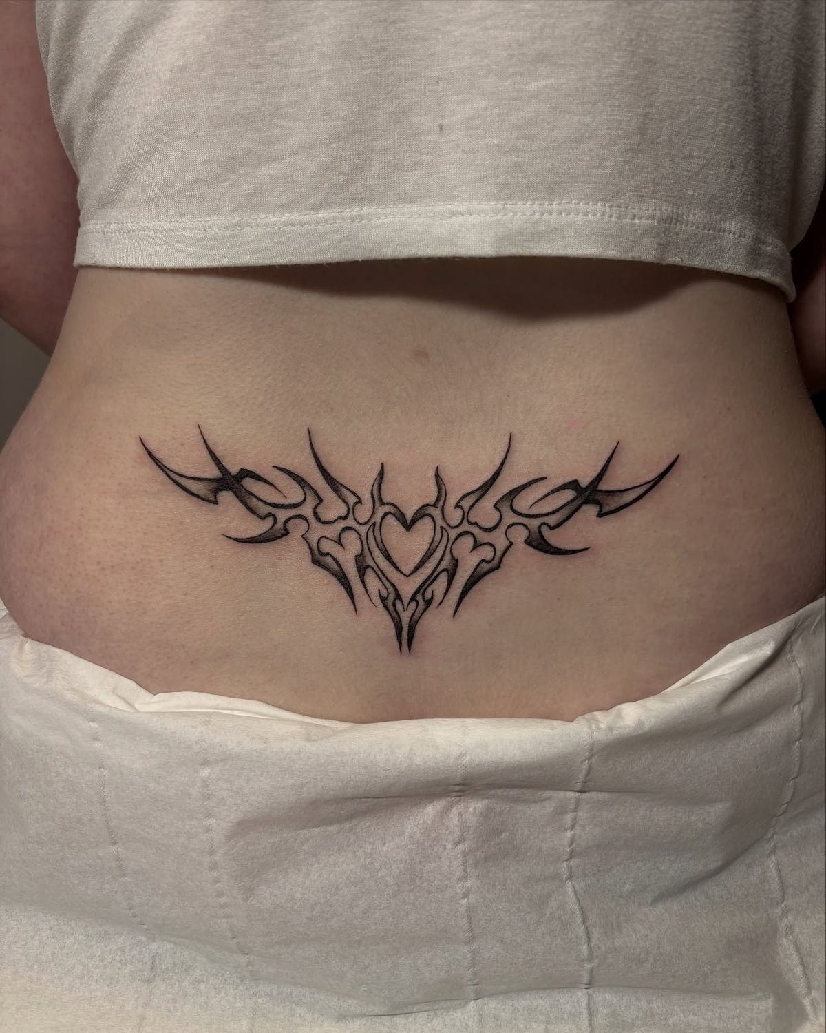 Now this is one of those lower back tattoo ideas that brings attitude and romance together in one clean hit. The tribal-inspired points give it edge, but the heart at the center softens everything just enough to make it feel flirty instead of harsh. It has that bold Y2K energy so many women are falling back in love with, only this version feels sharper and more polished. If you want a tattoo that looks fierce from far away and quietly sweet up close, this kind of design really knows how to do both.