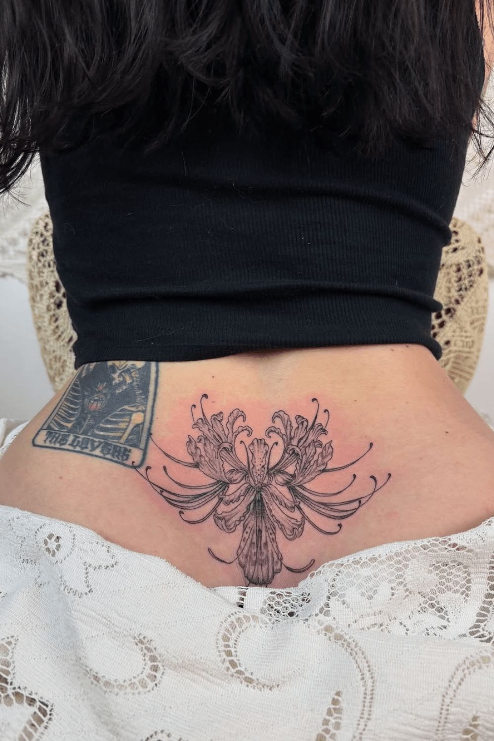 This piece has such an elegant, almost dramatic beauty to it. The central bloom opens across the lower back with long curling details that feel soft, decorative, and a little theatrical in the loveliest way. It gives the impression of a Flower unfurling right at the waist, which makes the whole design feel feminine and artful without becoming too busy. I love how it commands attention while still looking refined. It’s one of those tattoos that feels more like a statement accessory than just ink on skin.
