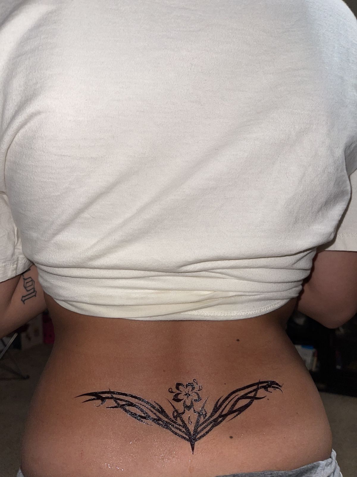 This design feels almost like a secret little spark at the center of the lower back. The soft, airy lines flare outward in a way that suggests tiny Wings or a feathered ornament, and that lightness gives it a beautifully feminine mood. It doesn’t feel loud or heavy. Instead, it has that subtle magic some tattoos carry when they look like they could have appeared there naturally. There’s a softness to it that makes the whole piece feel intimate and graceful, which is often exactly what women want from a tattoo in this placement.