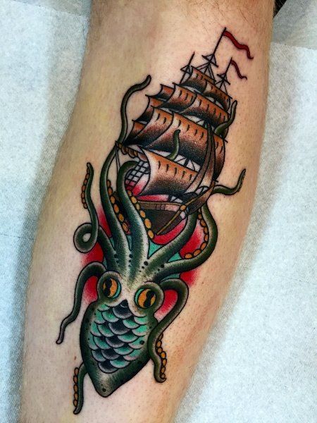 11. Kraken and Traditional Pirate Ship Tattoo
