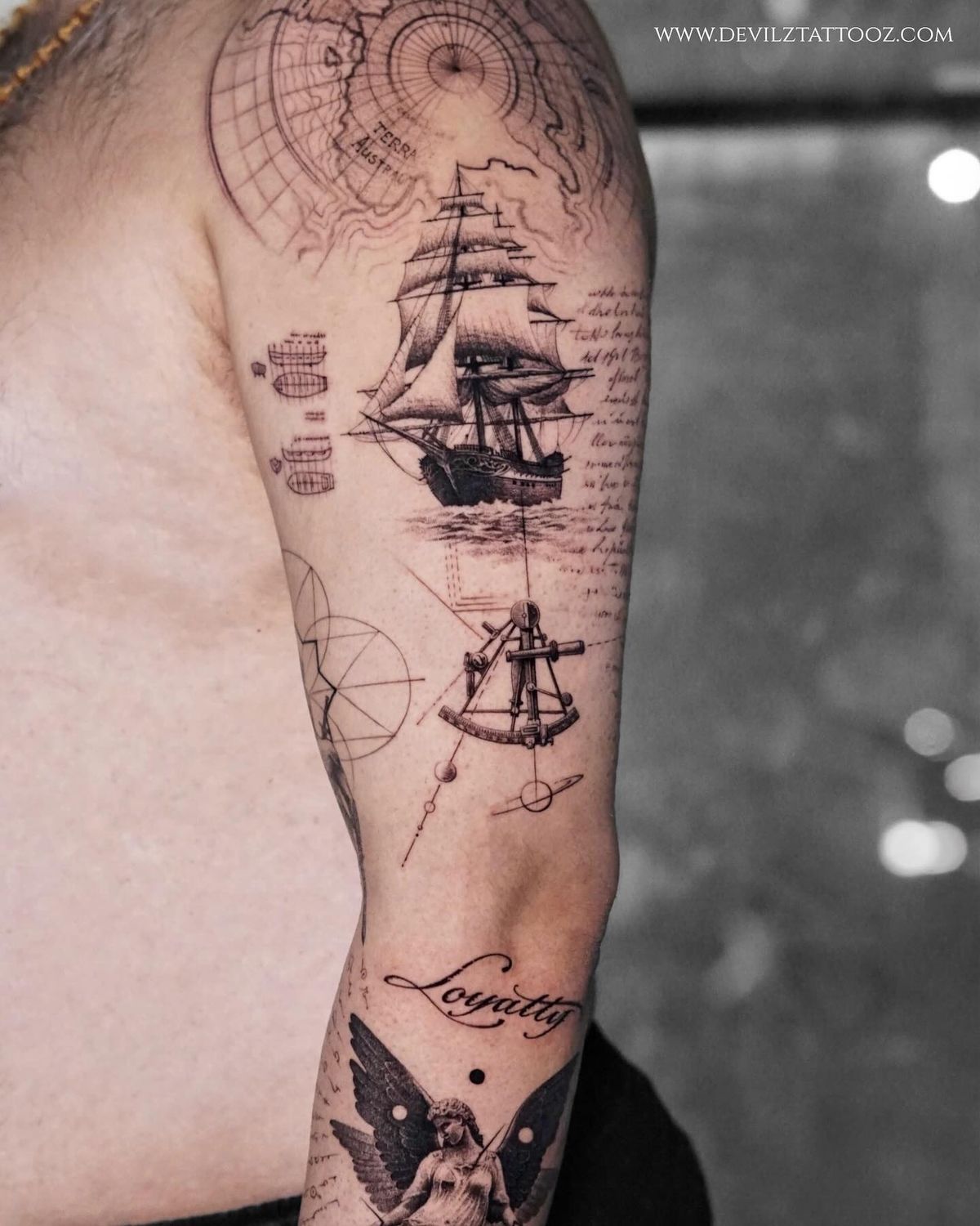 This tattoo feels intellectual, adventurous, and quietly poetic. The combination of a clipper ship, navigation tools, and old-map textures gives it a vintage explorer vibe—like a tribute to discovery, travel, and curiosity. It feels thoughtful, layered, and deeply personal.