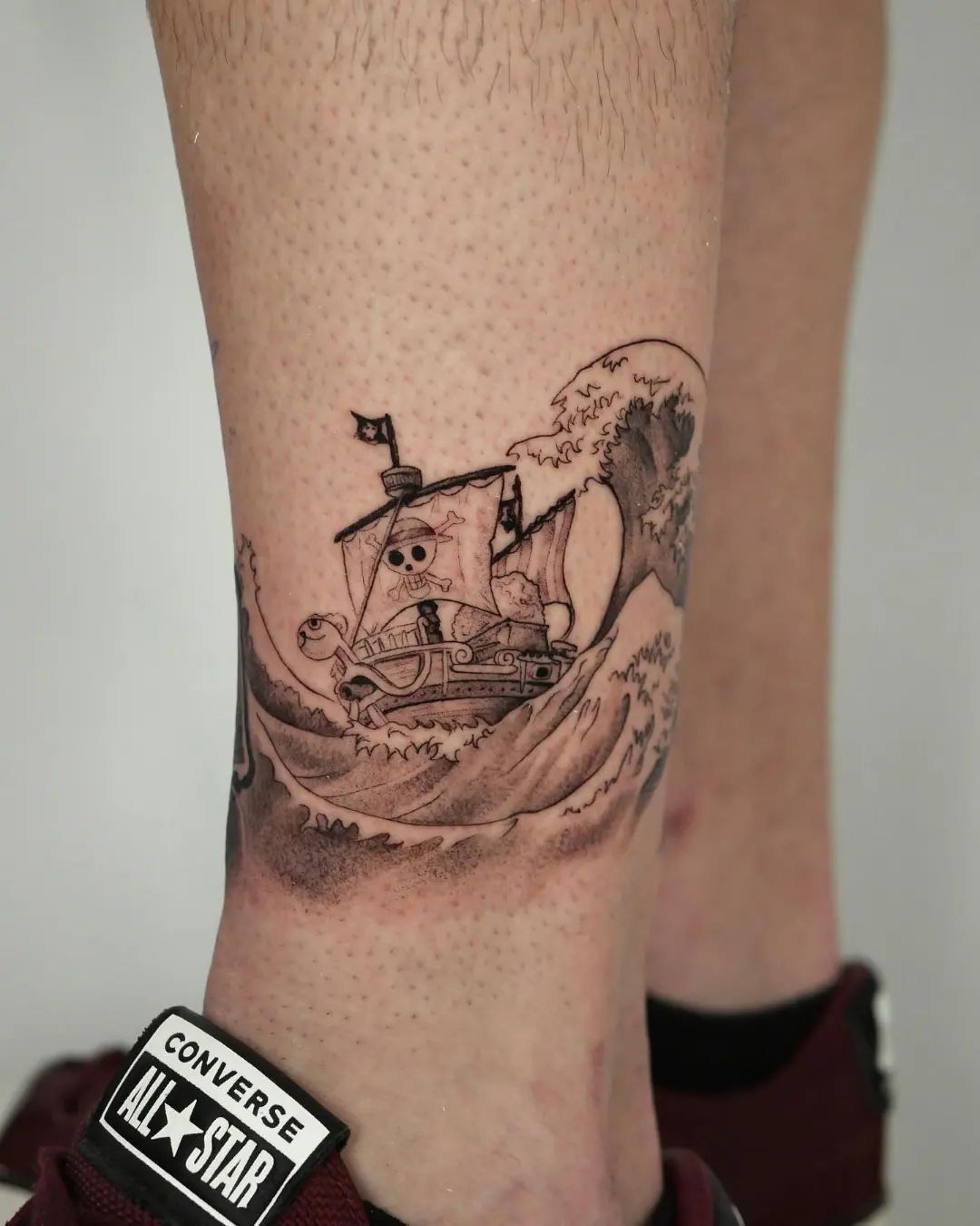 What makes this tattoo special is its storytelling. It’s ideal for people who connect with themes of strength, endurance, and overcoming rough waters. The balanced linework keeps it readable even with high detail, making it a strong choice for calf or forearm placement that will hold its impact over time.