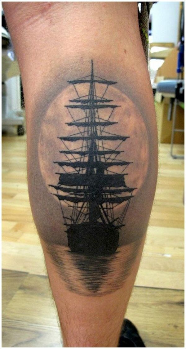 25. Cute Pirate Ship Calf Tattoo