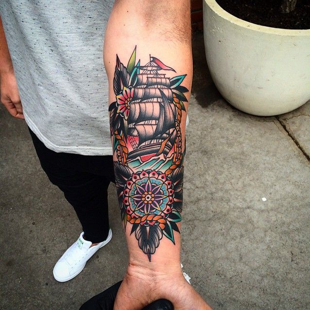 8. Traditional Floral Sailing Ship Forearm Tattoo