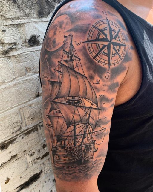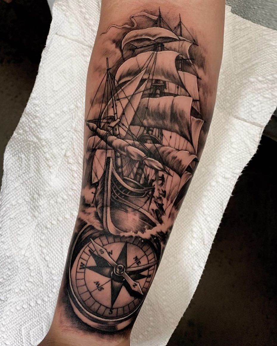 2. Realistic Sailing Ship and Compass Tattoo
