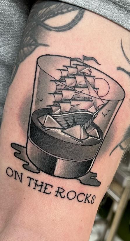 This tattoo feels clever, symbolic, and slightly rebellious. The ship trapped inside a glass paired with the phrase “On the Rocks” creates a layered metaphor—adventure, struggle, humor, and emotional storytelling all in one. It’s witty, stylish, and full of personality.