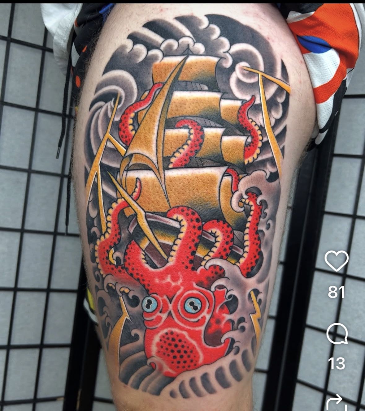 This tattoo feels fierce, dramatic, and unapologetically bold. The traditional pirate ship locked in a battle with a sea creature gives off a powerful pirate fantasy energy, like a legendary battle frozen in time. The rich colors, sharp contrast, and expressive creature design make it feel intense, cinematic, and full of attitude—the kind of tattoo that instantly commands attention.
