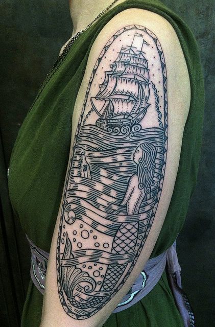 24. Mermaid and Traditional Ship Sleeve Tattoo