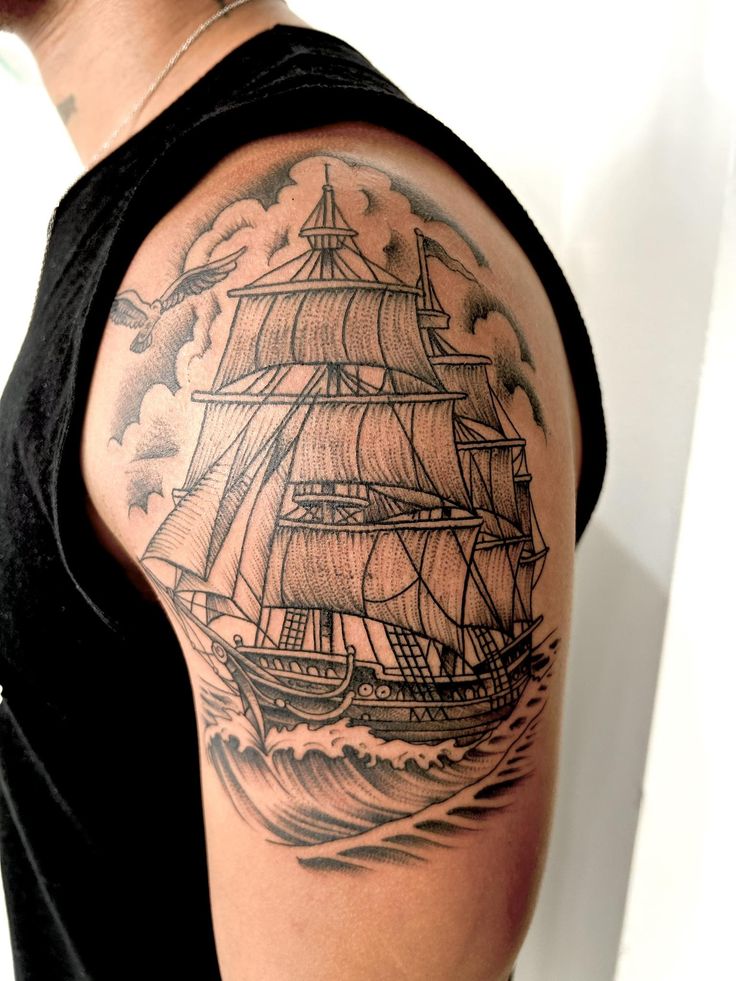 13. Traditional Tall Ship Shoulder Tattoo