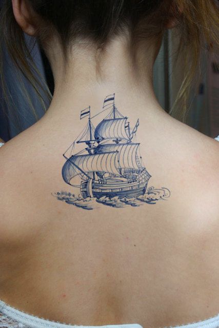 This tattoo feels light, delicate, and quietly poetic. The soft blue linework gives the ship a sketch-like quality, almost like a nautical illustration lifted from an old journal. Placed on the upper back, it feels intimate and personal—a private symbol of freedom, travel, and longing that doesn’t need to shout to be meaningful.