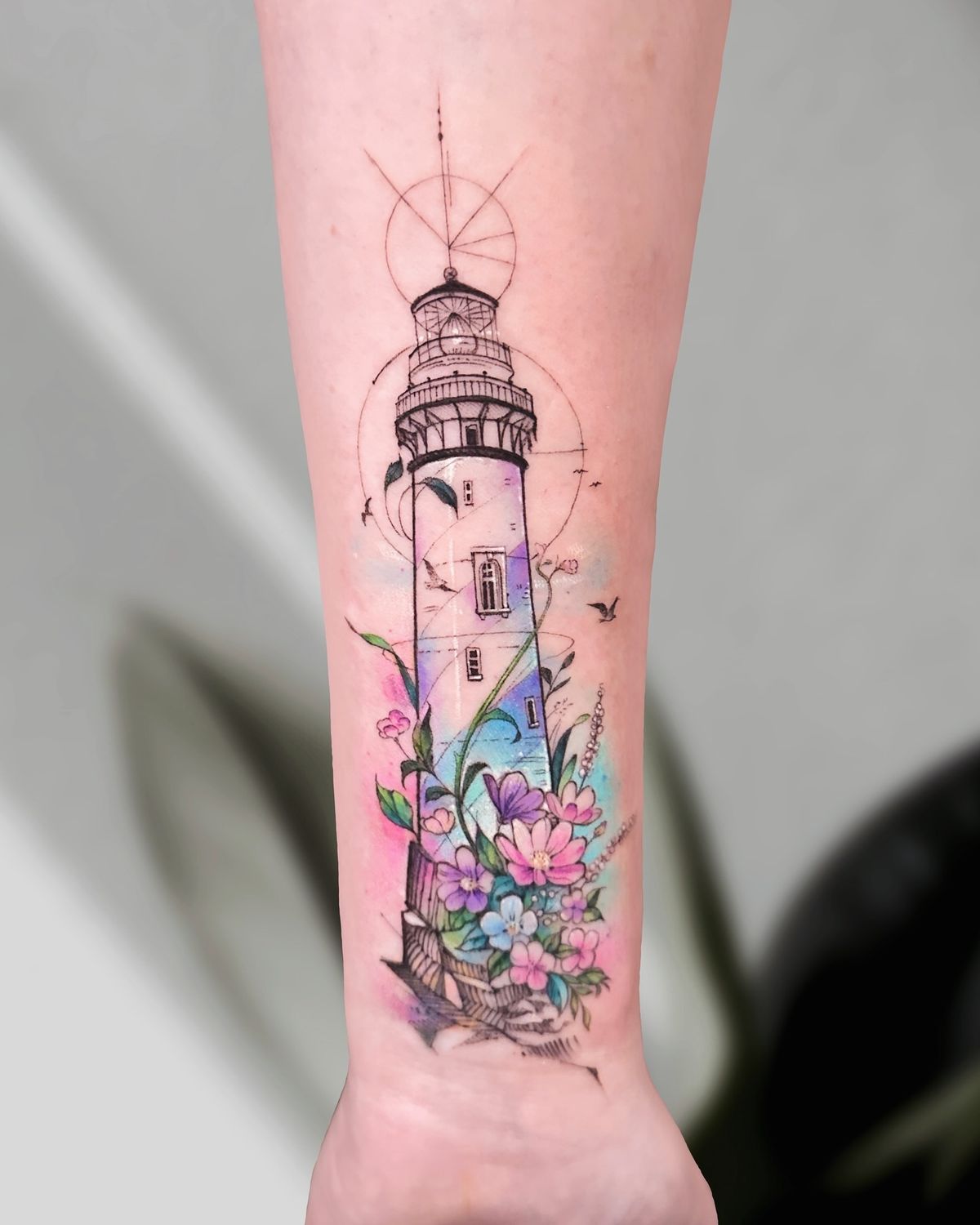 This tattoo feels soft, hopeful, and beautifully artistic. The lighthouse surrounded by florals gives off a gentle sense of guidance, safety, and renewal. The pastel tones and delicate details make it feel elegant, uplifting, and emotionally warm.