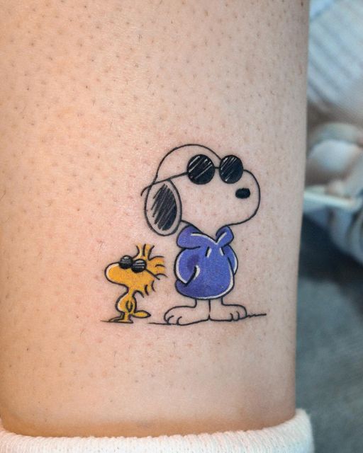If you grew up loving that laid-back Joe Cool attitude, this little Snoopy and Woodstock tattoo feels like a wearable mood. Both of them in sunglasses and casual outfits look like they’ve just stepped out for coffee, totally unbothered by the world. It’s playful without being childish, and it quietly says, “Yes, I’m grown, but I still know how to have fun.” For anyone hunting Snoopy tattoo ideas that feel modern, this tiny duo is a sweet reminder to take life a little less seriously.