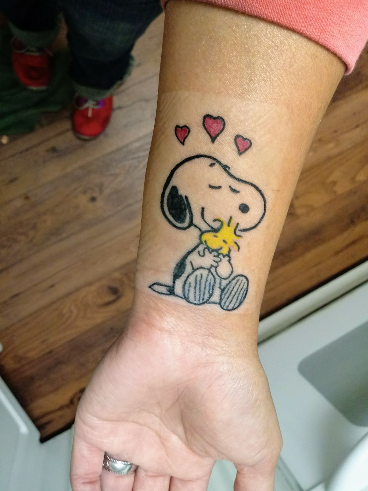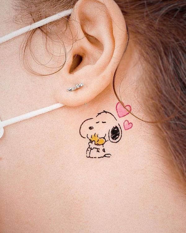 This tiny Snoopy hugging Woodstock behind the ear is the sweetest little secret. The soft color and sketchy lines make it feel almost like a doodle from the margin of your notebook, but the hearts keep it clearly about love and loyalty. It’s perfect if you’re looking for subtle Snoopy tattoo ideas for women who want something intimate and cute but still visible when your hair is up or you’re wearing a ponytail.
