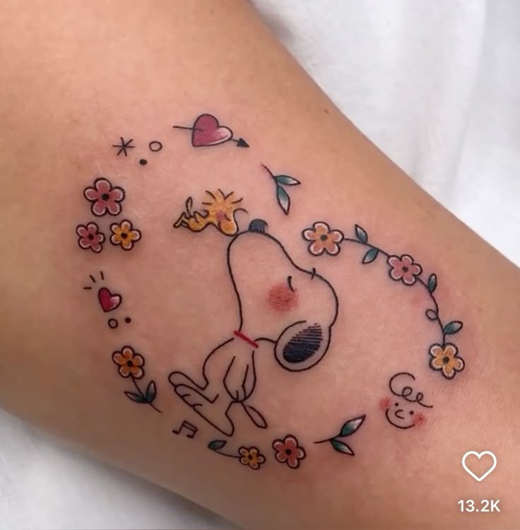If you love your tattoos a little whimsical, this design of Snoopy kissing Woodstock inside a circle of flowers and hearts feels like a tiny dream. The delicate blooms, floating hearts, and little notes give it a romantic, almost fairy-tale vibe. It’s one of those snoopy tattoo ideas for women who want something soft and feminine but still playful and not too serious. The blush on Snoopy’s cheek adds just enough emotion to make it feel intimate and sweet.