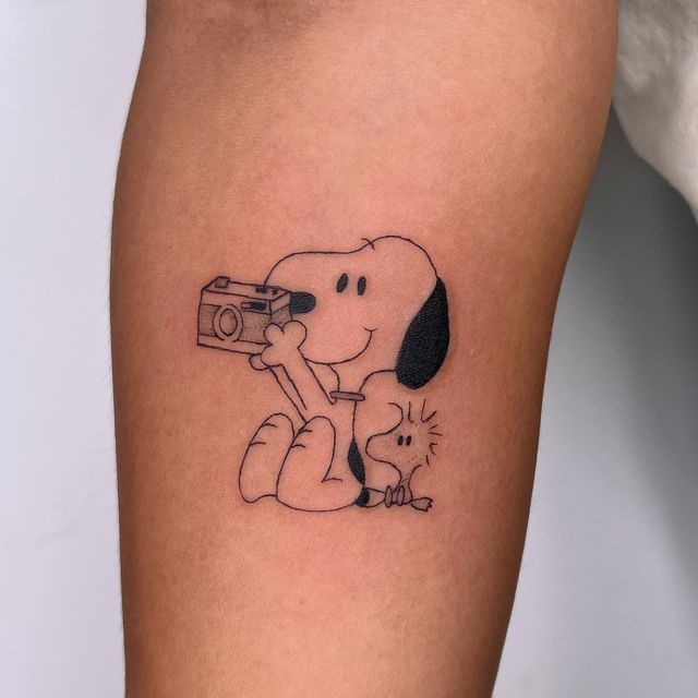 In this sweet design, Snoopy sits with a camera in hand while Woodstock snuggles close, like they’re about to capture their next adventure together. It’s such a charming nod to memory-making—perfect if you’re the unofficial photographer in your family or always documenting trips with friends. Out of all the Snoopy tattoo ideas, this one really celebrates the joy of pausing to notice the little moments.