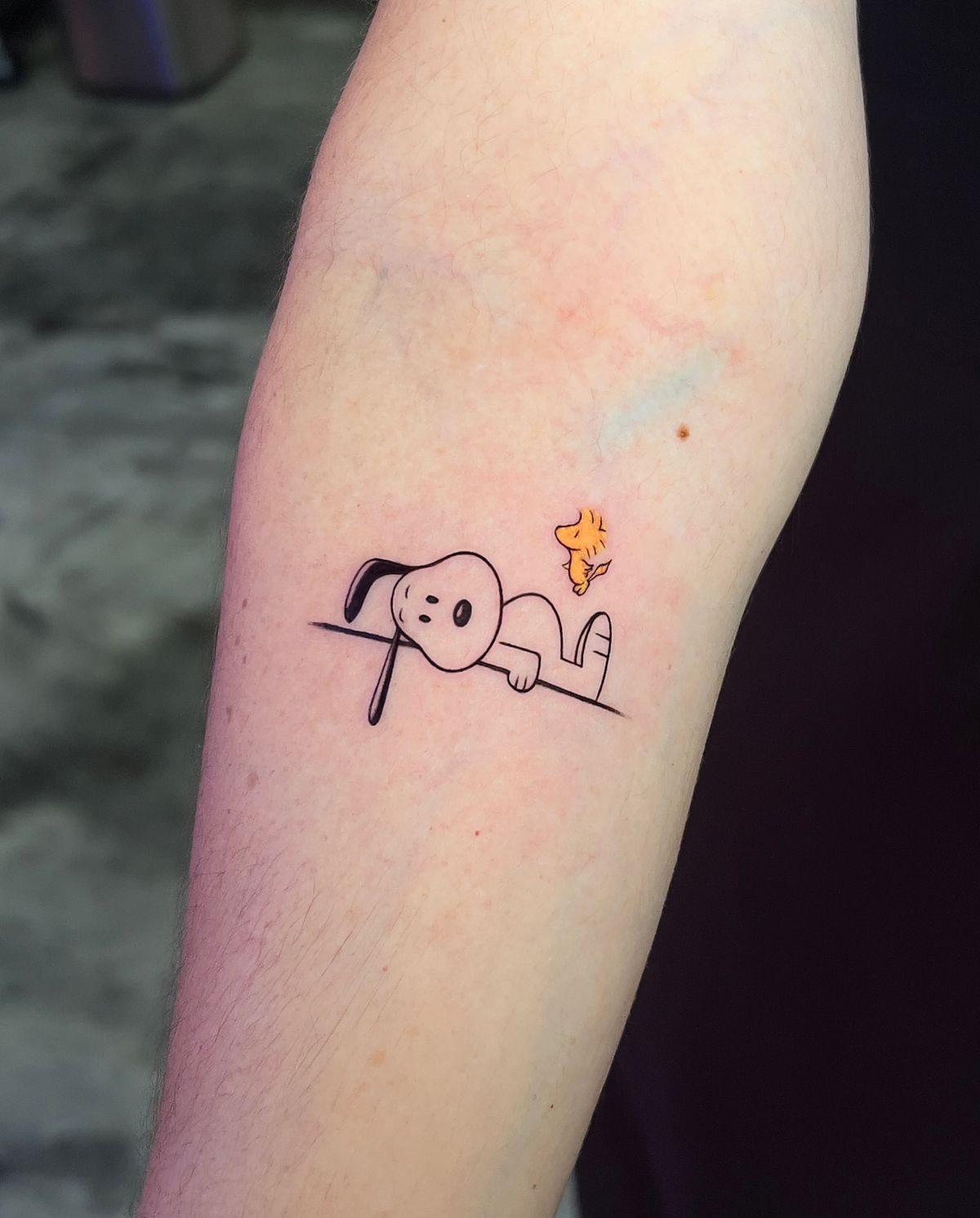 Emotionally, this is such a feel-good piece; every time you catch it, you’re reminded of safe spaces and long talks. If you tend to worry that tattoos might look too harsh, this design proves they can be soft and story-driven instead. The small scale means it won’t overpower your arm or leg, and the fine-line details keep it airy. For anyone compiling ideas peanuts fans will instantly understand, this one quietly celebrates connection, simple pleasures, and the joy of just “being” with someone.