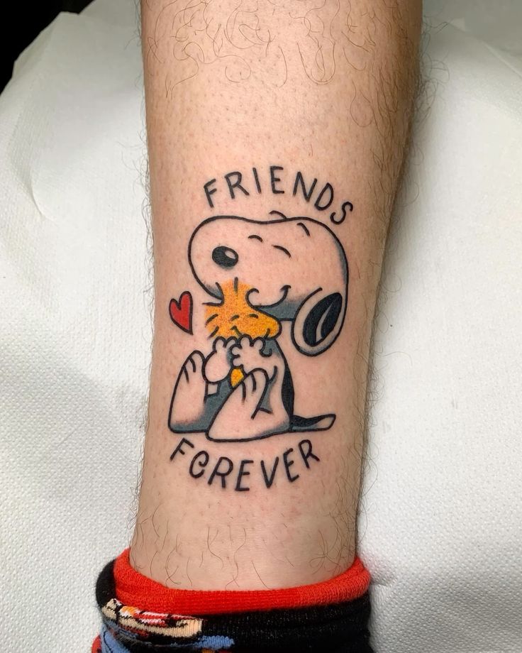 Snoopy hugging Woodstock with “Friends Forever” curved around them feels like the ultimate friendship pledge. The bright colors, smiling faces, and little heart give this piece the energy of a childhood sticker upgraded into grown-up ink. If you’re searching for Peanuts ideas that celebrate lifelong bonds—whether that’s your sister, your best friend, or even your own inner child—this is such a heartfelt way to honor it.
