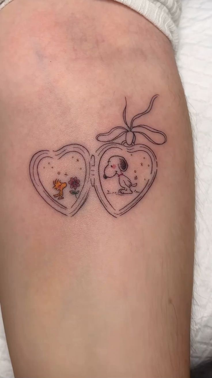 Due to the meticulous work on the design, this tattoo requires more attention. Therefore, treat it like jewelry that you never take off, and you should moisturize frequently, avoid tight clothing during the healing, and schedule a touch-up after a year or two if those tiny stars fade. This locket-style design is a perfect compromise if you like dainty and minimalistic designs while still alluding to the Peanuts theme.