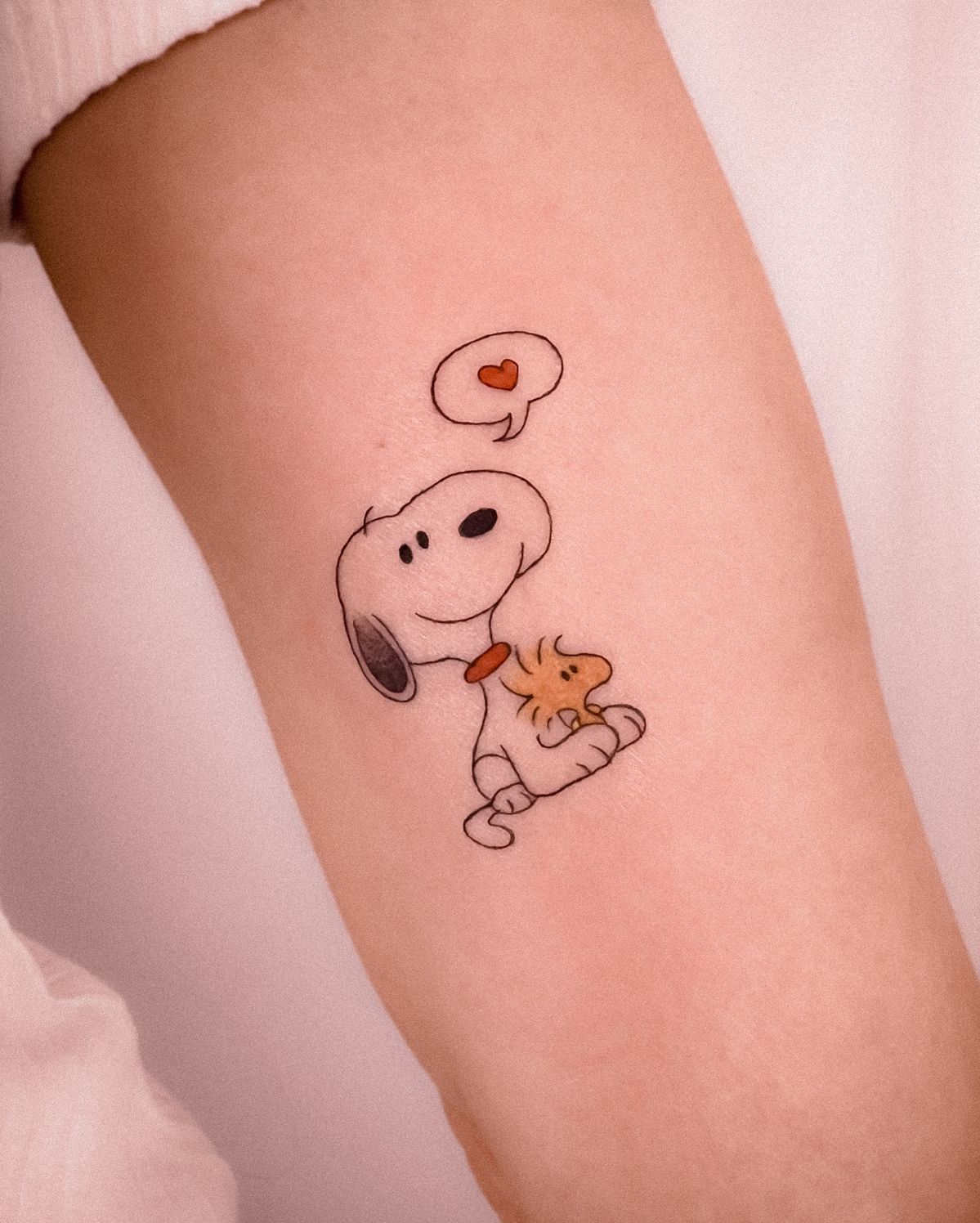 Here, Snoopy cuddling Woodstock with a little heart in a speech bubble feels like a soft conversation about love that’s always ongoing. It’s sweet without being overly girly, and it carries that familiar Peanuts humor and warmth. If you’re browsing Snoopy tattoo ideas for women who want something emotional but still lighthearted, this one hits the mark. It reads like a tiny comic panel about loyalty, friendship, and the joy of having “your person.”
