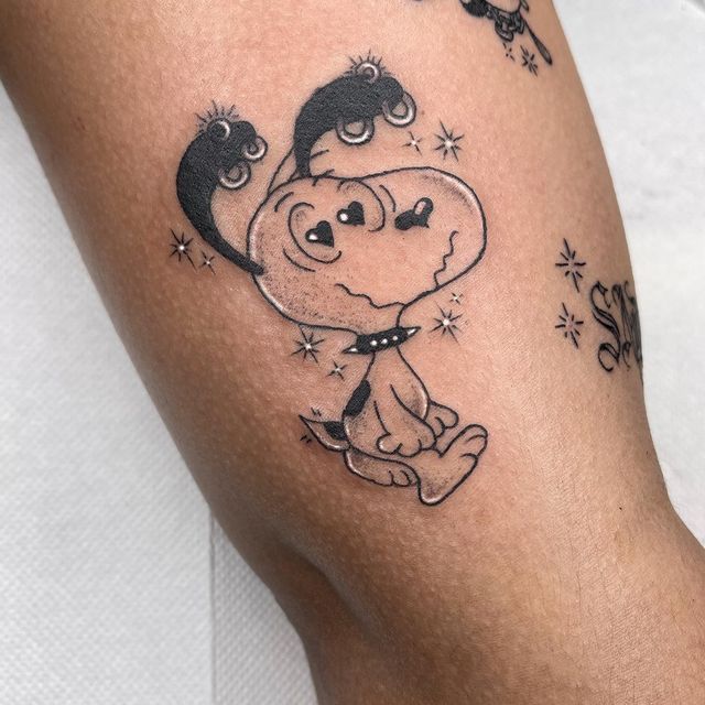 This sparkly Snoopy with heart-shaped eyes has such a dreamy, almost Goth sweetness to it. The big black ears, tiny collar, and stars floating around him feel like a mix between cartoon and old-school Trad attitude. It’s one of those Snoopy tattoo ideas that lets you show off your soft side and your edge at the same time—romantic, but not overly sugary. If you’ve always loved Peanuts and also collect a little rock-and-roll flash, this design hits a really fun middle ground.