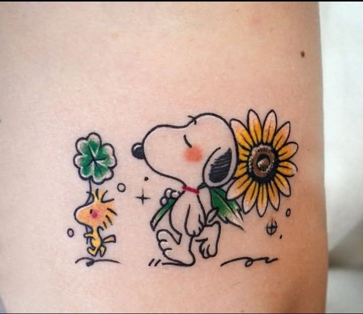 This bright, happy tattoo shows Snoopy and Woodstock strolling with a clover and a sunflower, cheeks slightly flushed like they’re enjoying the best day ever. It has that joyful, head-held-high energy we all crave as we get older—content, confident, and a little bit whimsical. It’s ideal if you’re after Snoopy tattoo ideas that celebrate optimism and tiny everyday blessings.