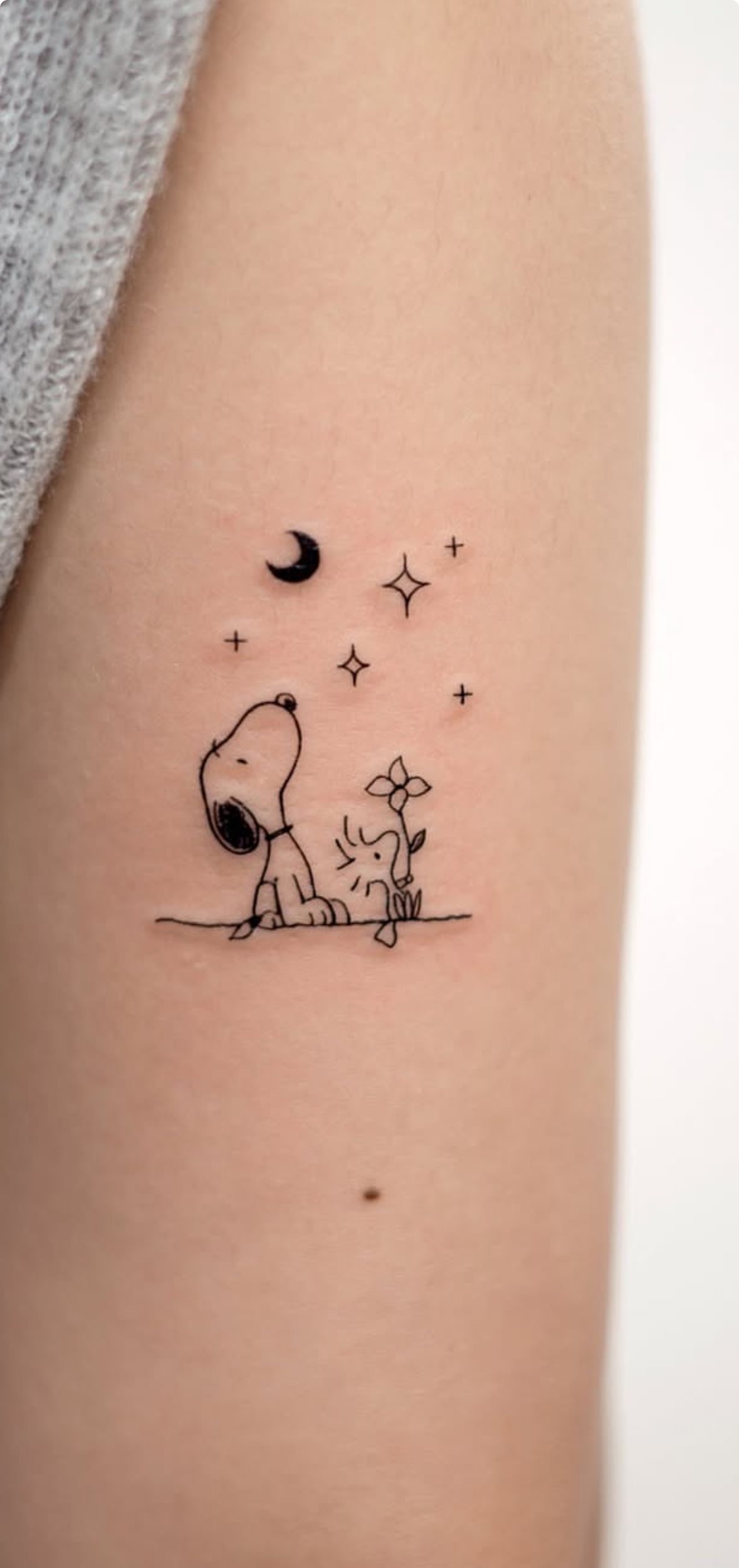 Here, Snoopy and Woodstock sit side by side under a crescent moon and scattered stars, as if they’re sharing a late-night heart-to-heart. The single-line style is graceful and understated, almost like a sketch from a beloved comic strip. If you’re drawn to Snoopy tattoo ideas that feel more like illustrations than bold flash, this design brings that quiet, contemplative mood to life.