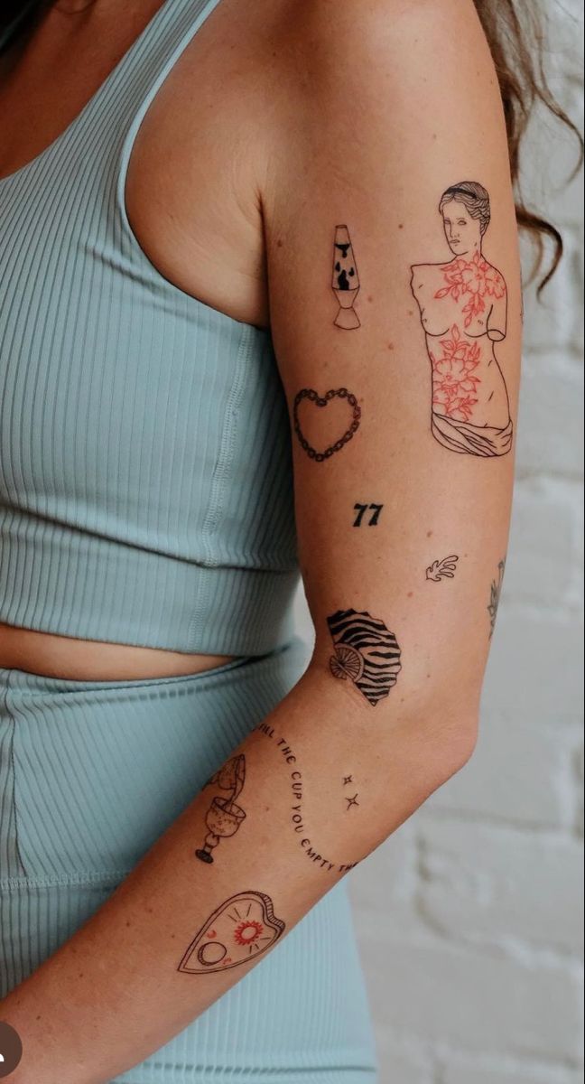 This arm feels like a tiny art gallery you get to wear. The floral figure, shell, heart, lava lamp, little hand, and curved text make the whole sleeve feel creative, intimate, and softly offbeat. It has that perfect sticker-style balance between classic and quirky, which is honestly one of the hardest moods to get right. The figure gives it a little romance, the shell brings in a subtle Ocean note, and the smaller icons keep the look playful. It is feminine without being too precious and artistic without looking like it is trying to impress anyone. That easy confidence is what makes it so pretty. You can tell each piece meant something, even if the reasons are only known to the person wearing them.