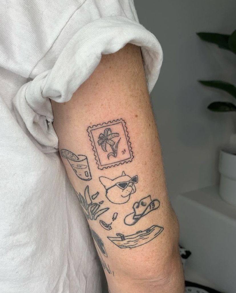 This sticker sleeve tattoo idea feels like a little scrapbook of personality living right on the arm. I love how it mixes a tiny framed flower stamp, a cool cat in sunglasses, and a few scattered everyday doodles that somehow make the whole thing feel intimate and witty at the same time. It has that “I collect memories, not just things” energy, which is exactly why sticker-style work can feel so addictive. Nothing is too polished, and that is the charm. Each piece reads like a small private joke, a soft memory, or a passing mood that mattered enough to keep. It lands in that sweet spot between Cute and clever, with just enough negative space to let every tiny symbol breathe.