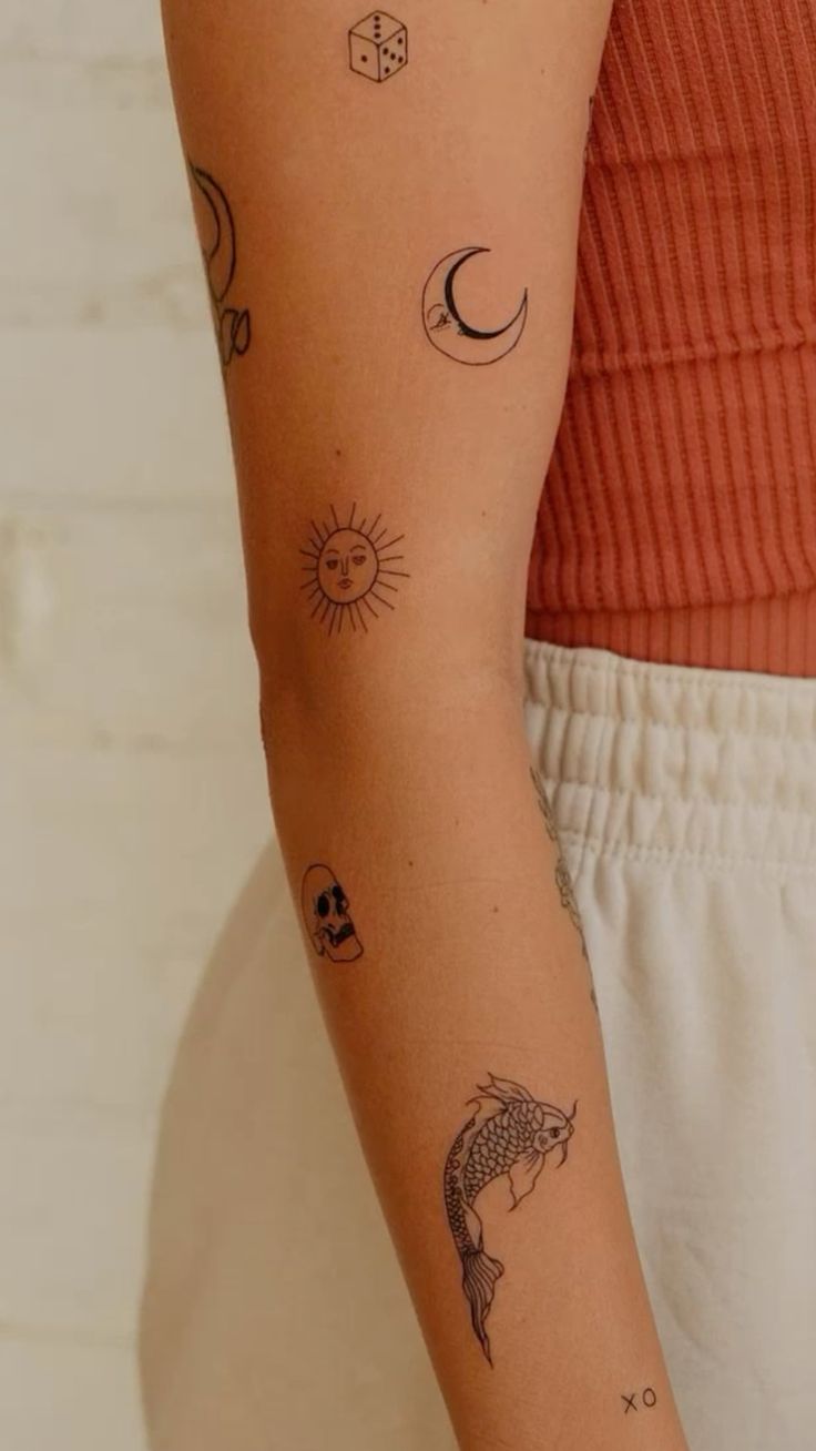 This kind of placement works beautifully for anyone building slow, thoughtful ideas over time, especially on the upper arm, where pieces can grow naturally without feeling crowded. It suits both women and men who like a relaxed, collected look rather than one heavy Full design. Ask for fine line or Fineline work if you want that crisp sticker effect to stay light and modern. It is especially nice as filler between larger pieces later on, because the tiny motifs can tie everything together without forcing a theme. Style-wise, this one shines when you keep each tattoo simple and distinct, so the sleeve still feels spontaneous instead of overplanned.