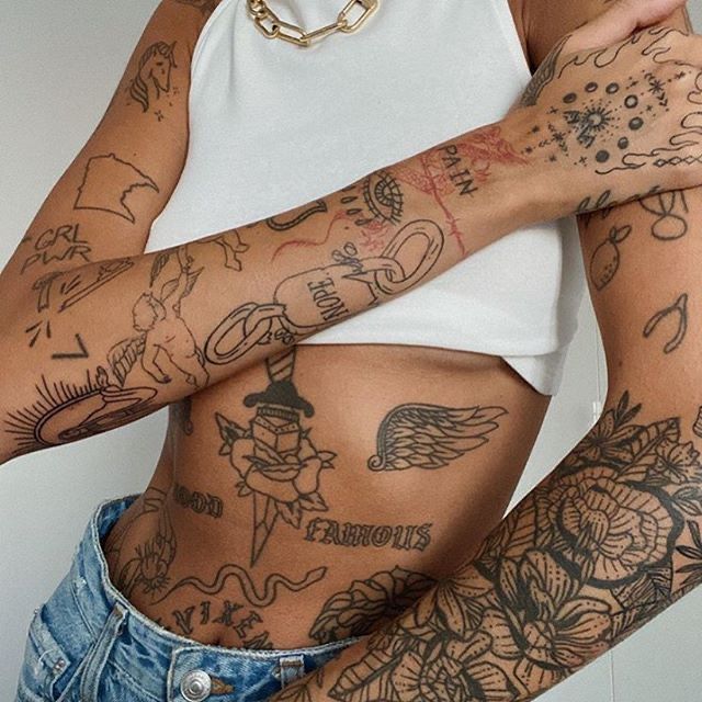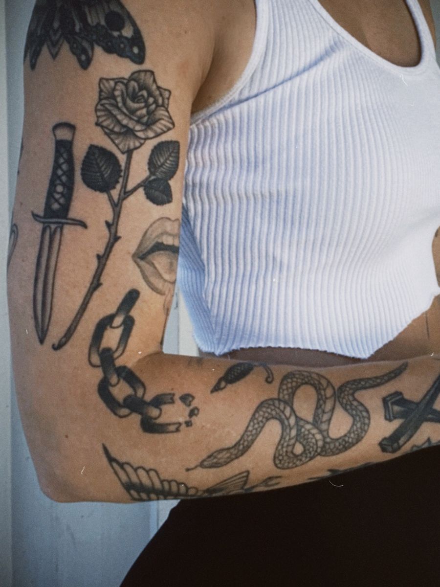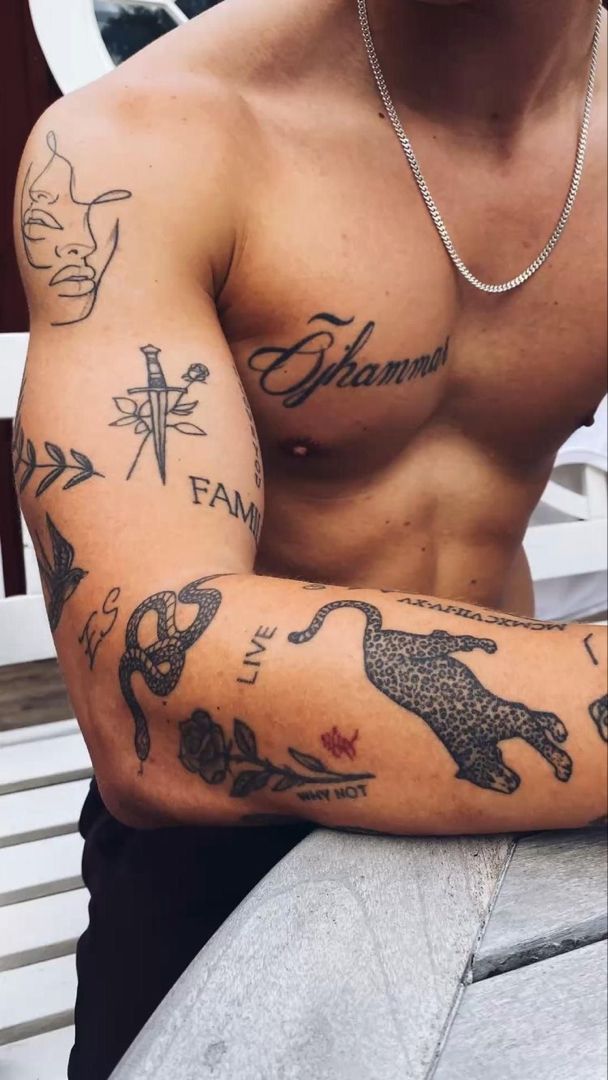 This one has that strong, magnetic sticker sleeve attitude that pulls you in immediately. The mix of script, snake, panther, dagger, rose, and abstract face linework gives the whole arm a fearless rhythm. It feels a little wild, a little romantic, and very self-assured, like someone who knows exactly how to blend softness and danger in one look. I really like how none of the tattoos are overly tiny here; each one has enough presence to make the arm feel intentional without becoming one solid block. It is a great reminder that sticker sleeves are not only delicate or dainty—they can also be bold, masculine, and full of movement. There is a real old-school-meets-modern energy to it that reads effortlessly cool.
