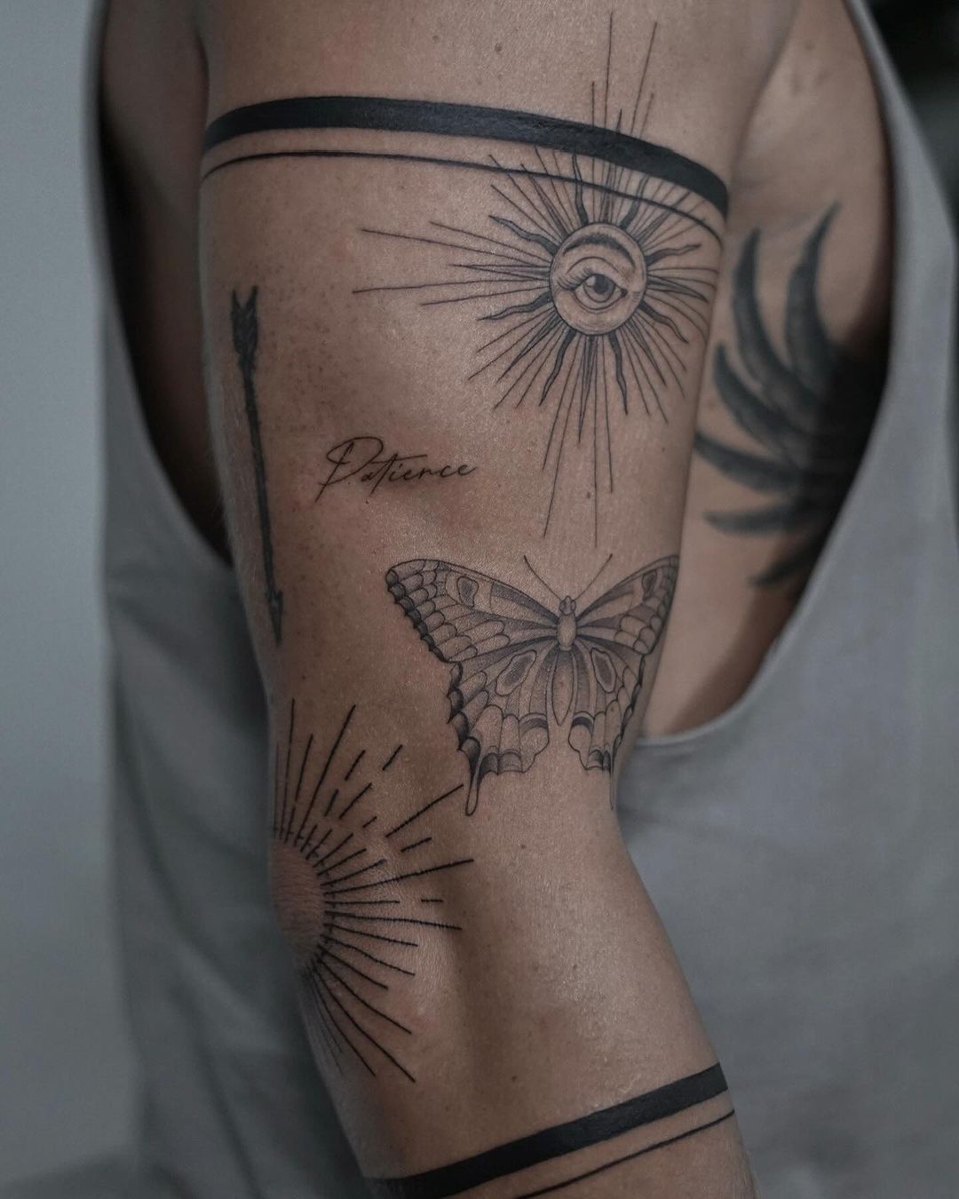 What makes this cut—well, this tattoo style—feel special is how it blends statement pieces with minimal control. The bands create instant structure, while the butterfly and eye keep the design expressive. This is a strong option for both men and Women who want placement that feels deliberate and visually balanced. Fine line details work especially well beside heavier black elements because they stop the style from feeling too harsh. If you like sticker sleeve ideas but want something more polished than scattered filler alone, this design gives you that clean 2026 update without losing the personal feel.