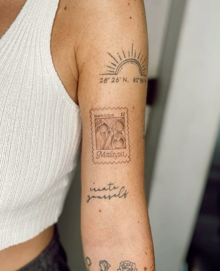 This one feels so personal in that subtle, grown-up way that really stays with you. The tiny rainbow-like coordinate piece, the postage stamp design, and the handwritten script create a somber mood that is part travel diary, part love letter to a place or a moment. I adore sticker tattoos like this because they are sentimental without becoming overly sweet. There is structure in the stamp, softness in the script, and just enough symbolism in the location details to make the whole arm feel meaningful. It has an understated elegance that makes you lean in closer, which is often the secret to tattoos that age beautifully. Instead of shouting for attention, it quietly invites curiosity.