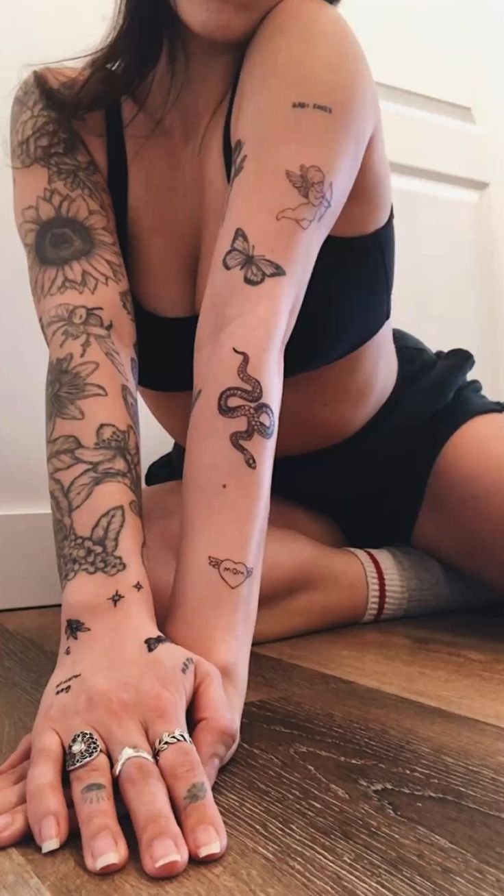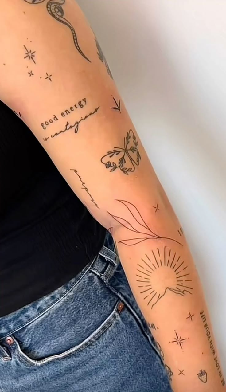This style is gorgeous for women who want a lighter, more expressive arm story without going too heavy too fast. It works especially well with fine-line tattoos and smaller designs spaced from shoulder to wrist so each image keeps its own identity. If your vibe leans Cute, Girly, or Dainty, this is an easy way to build around those themes without making the sleeve feel too themed. Pairing tiny stars, script, and sentimental icons also keeps things fresh for 2026, especially for aesthetic women who want tattoos that feel collected rather than perfectly matched. The beauty here is that you can dress it up with gold jewelry, denim, or a clean tank, and the tattoos become part of your whole style language.