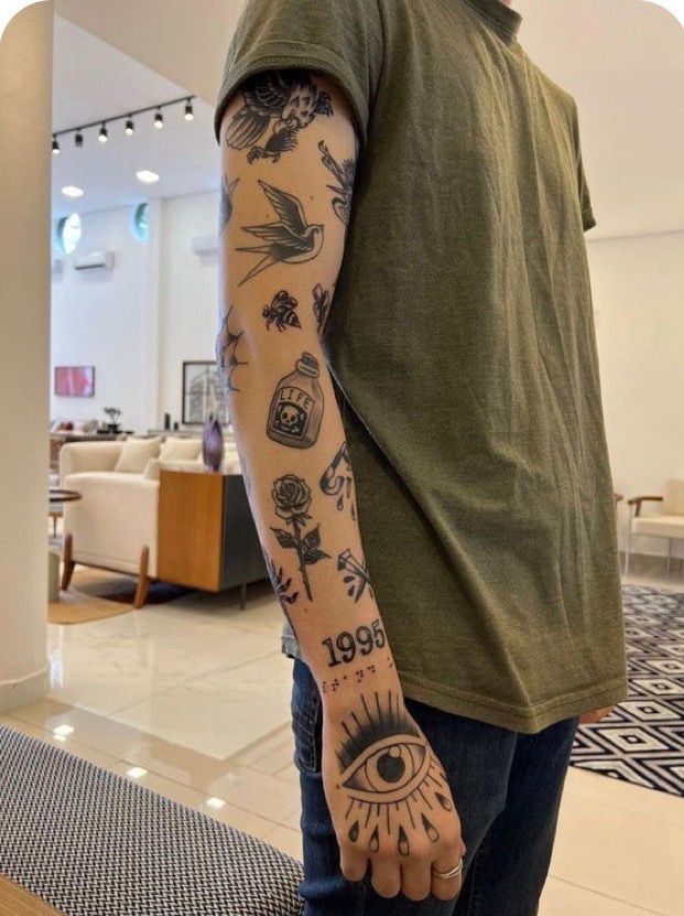 This sticker sleeve leans darker, moodier, and a bit more old-school, and it looks fantastic because of it. The eagle, swallow, bottle, rose, bee, year marker, and dramatic eye on the hand come together like a set of symbols from different chapters of the same life. It feels grounded and a little mysterious, with enough blackwork to make a statement but enough spacing to keep the arm from looking visually heavy. There is something really satisfying about a sleeve that mixes toughness with meaning like this. It is not precious, not overly polished, and not trying to be trendy. It just has presence. That kind of energy tends to age beautifully because it comes from strong shapes and strong choices.