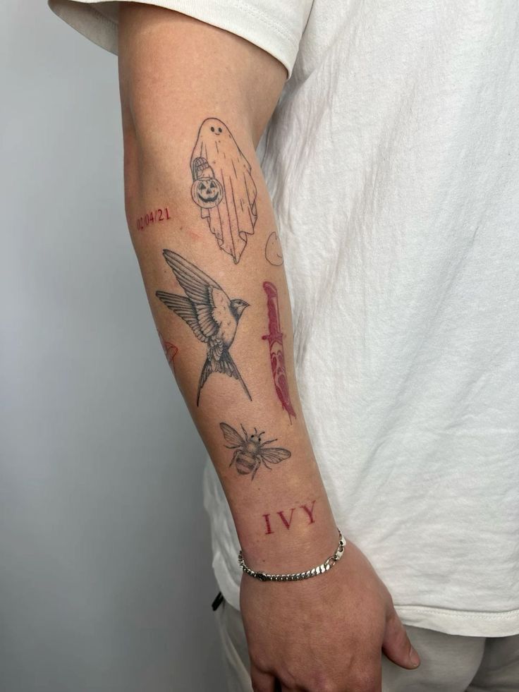 This sticker sleeve tattoo idea has a darker, more cinematic mood, and honestly, that is what makes it so striking. The ghost, bird, dagger, bee, and scattered lettering create this beautifully offbeat little universe that feels half sentimental, half rebellious. It is giving diary pages, old film stills, and tiny symbols with bigger emotional weight. I love a sleeve like this because it does not feel overly matched, yet it still tells a story. The red accents wake everything up and add edge without overpowering the softer black linework. It feels expressive in a very grown-up way—less about trends, more about instinct, memory, and choosing pieces that hit you in the chest for reasons you cannot always explain.
