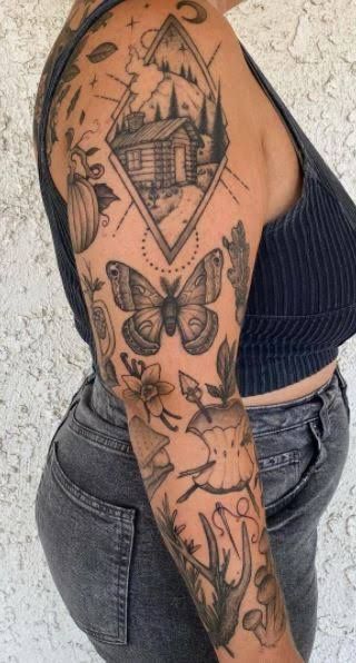 This sleeve has such a rich, storybook atmosphere to it. The cabin scene, moth, flowers, pumpkin, and sweeping botanical shapes create a tattoo composition that feels earthy, dreamy, and a little enchanted. It leans more connected than some sticker sleeves, but each element still reads like its own little treasure, which gives it that layered sticker quality while keeping the flow beautifully cohesive. There is warmth in it, too—something almost seasonal and nostalgic, like late summer turning into fall. I love how the moth anchors the arm while the Floral and Nature details soften the whole design. It feels romantic, grounded, and quietly magical without crossing into anything too literal.