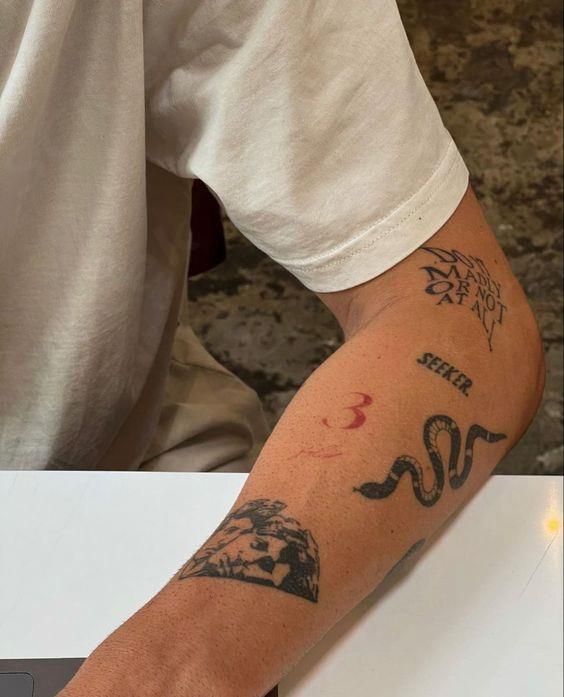 This sleeve has that soulful, collected quality that makes you want to stop and study every piece. The snake, the text, the number, the lion-like image—everything feels chosen with intention rather than picked just for looks. It gives the arm a strong emotional undercurrent, almost like each tattoo is carrying a lesson, a warning, or a private reminder. I love sticker sleeves like this on men because they feel expressive without becoming overly decorative. There is a little grit, a little philosophy, and a very clear sense of self in the mix. It feels personal in a grounded way, the kind of tattoo story that grows out of real life instead of trend boards.
