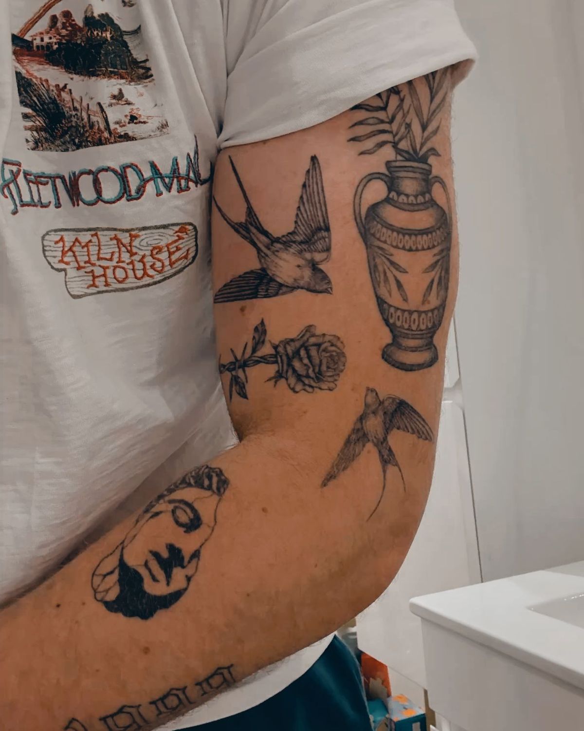 This sleeve leans into timeless imagery, and that is exactly why it feels so good. The swallows, rose, ornate vase, and classical face create a sticker sleeve that feels rooted in old-world beauty while still reading modern on the skin. There is a calm confidence to these motifs. They are not trendy in a fleeting way; they are the kinds of designs people keep returning to because they always carry meaning, grace, and a little romance. I really love how the sleeve feels collected but still cohesive, almost like a small gallery of things that never go out of style. It has warmth, elegance, and just enough edge to keep it from looking too precious.