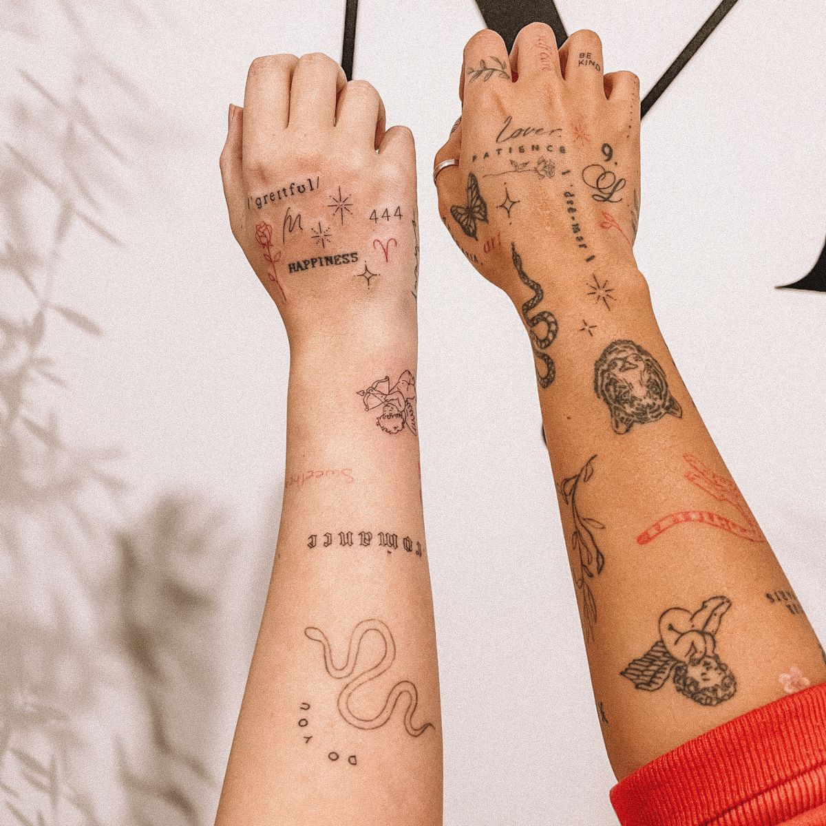 This tattoo collection has that lovely, instinctive sticker-sleeve magic where nothing matches perfectly, yet everything still belongs. Tiny stars, words, a butterfly, a snake, cherubs, lucky numbers, script, and a mix of black and soft red details all come together in a way that feels expressive and alive. I really like this look because it feels collected from emotion rather than logic. It is part spiritual, part romantic, part playful, and somehow still stylish enough to feel curated. The hand tattoos especially add that fearless little extra something. They make the whole vibe feel more committed, more fashion-forward, and just a bit more daring without tipping into anything too harsh.