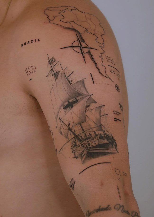 This works especially well for ideas for men, though for women who love bolder storytelling tattoos, it can be just as striking. The upper-arm placement gives a large focal design enough room to breathe, while smaller geometric details can act as filler around it later. If you are drawn to Western travel imagery, map references, or maritime themes, this is a strong way to build a sleeve that feels cohesive without looking too planned. Compared with tiny fine line sticker collections, this style has more visual weight and a more cinematic payoff, which makes it perfect for anyone ready to move toward a more Full tattoo story.