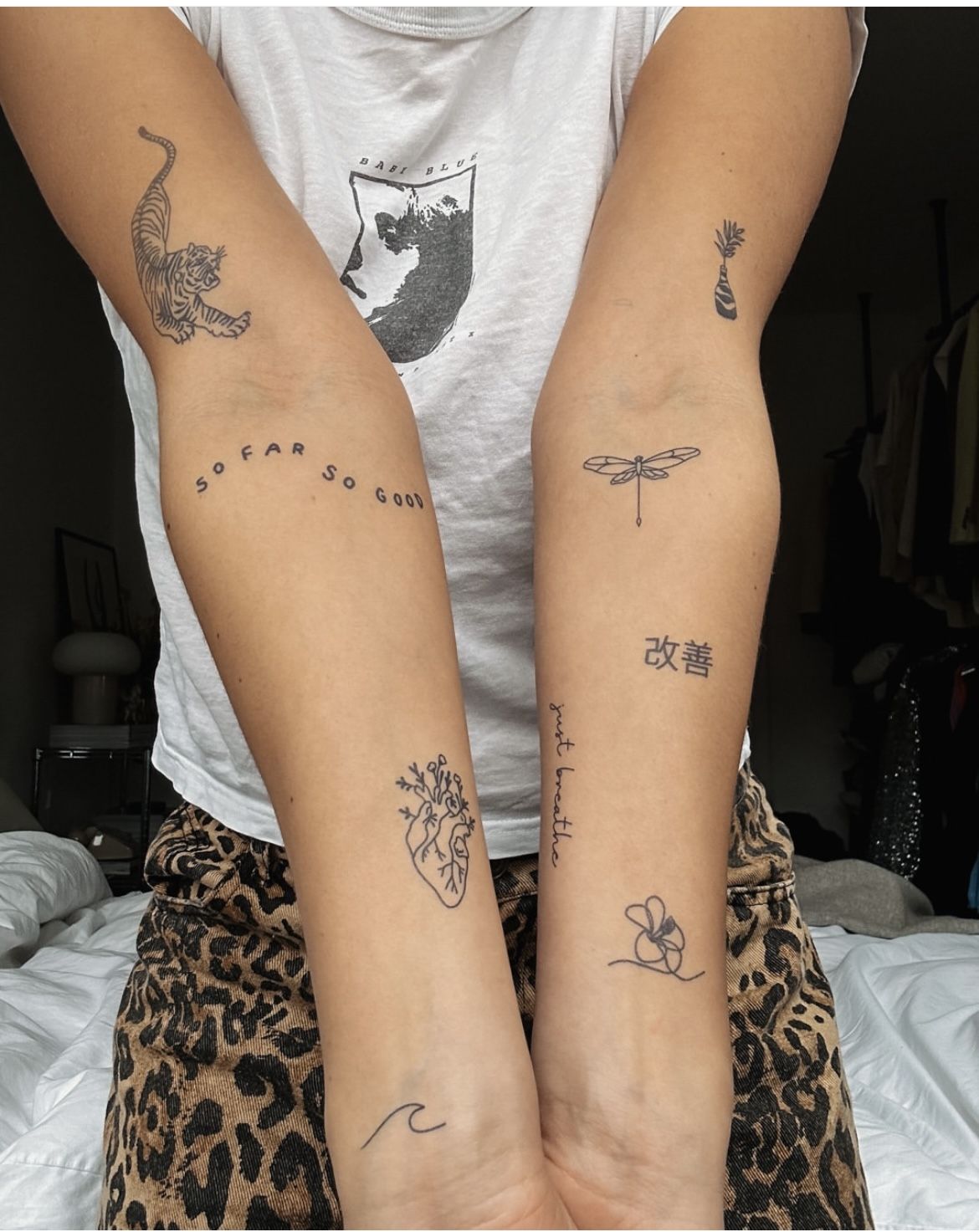 There is something so quietly confident about a sticker sleeve built from separate symbols that do not need to explain themselves. A tiger, a dragonfly, a little vase, a wave, a heart, a phrase across the arm—this kind of mix feels personal in the most modern way. It is not trying too hard, and that is exactly why it looks so good. The overall mood is calm, intelligent, and a little poetic, like someone who has lived enough to know that style does not have to be loud to be unforgettable. I especially love how the spacing gives each design a moment of its own, creating a sleeve that feels airy instead of crowded. It reads as aesthetic women’s energy, but honestly, it can swing beautifully either way.