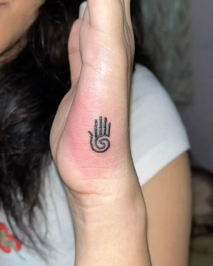This little symbol has the kind of presence that tiny tattoos do so well when they are done right. It is compact, graphic, and full of meaning possibilities, especially if you are drawn to spiritual signs, protection motifs, or designs that feel personal without needing explanation. The spiral set into the palm-like shape gives it a grounded, almost talismanic mood. It feels intimate and strong at the same time, which is why it lands so beautifully as a tiny tattoo idea. It is not flashy, but it absolutely has soul, and that makes it memorable.