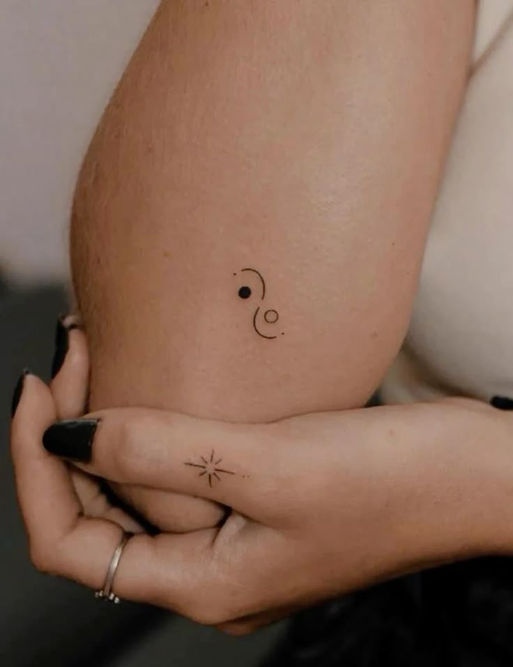 This tiny abstract symbol has that quiet, magnetic quality some tattoos carry without ever needing to explain themselves. A small dark dot, two airy curves, and a tiny spiral somehow come together to feel cosmic, personal, and a little bit poetic. It gives the impression of balance, orbit, rhythm, maybe even a private kind of Meaning that only the wearer fully understands. That is part of what makes tiny tattoo ideas like this so appealing. They do not overwhelm the body or the outfit, but they still shift the whole mood. This one feels especially aesthetic, like a handwritten thought translated into ink, and it has that soft mystery that makes people look twice.