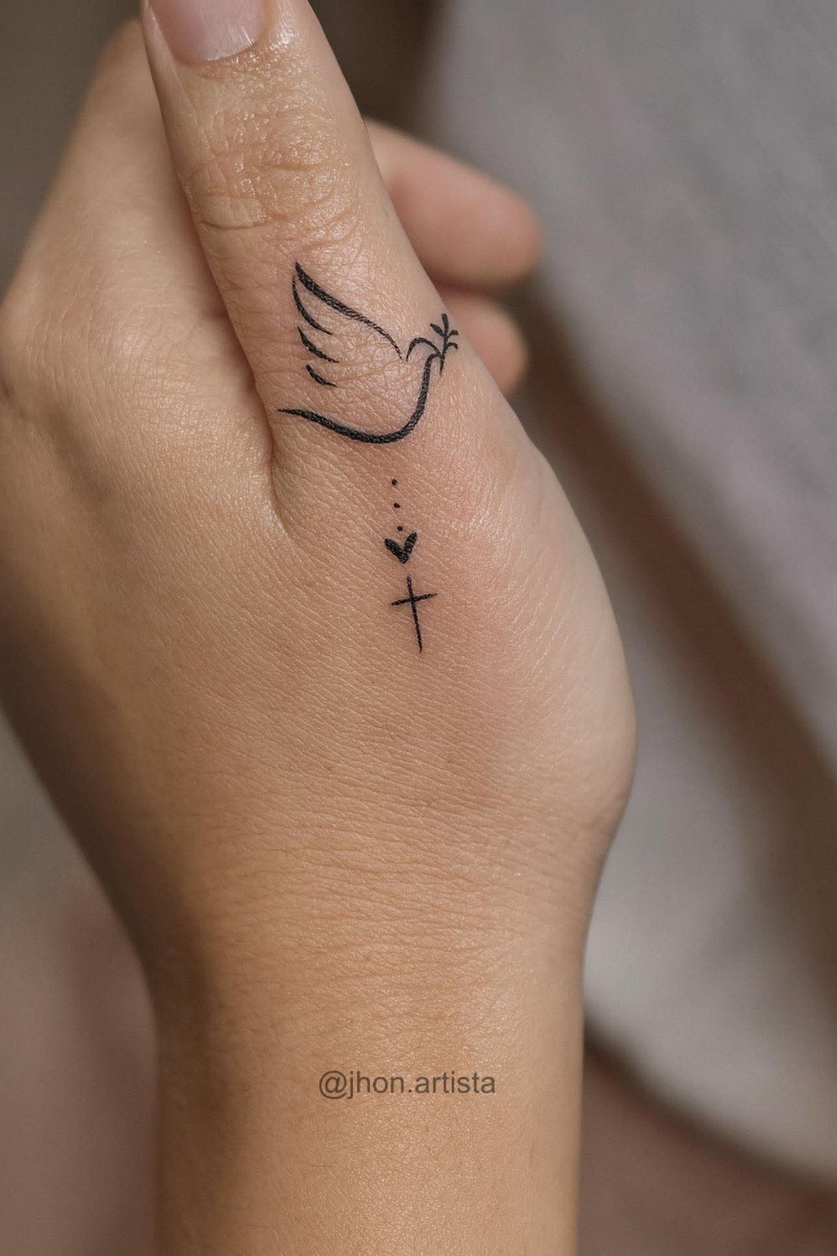 This design works especially well on hand Placement because the vertical flow helps the tattoo sit naturally along the shape of the skin. It is lovely for women, but it can absolutely work for men too when kept crisp and minimal. If you want something more delicate than a larger religious piece, this is a smart choice because it stays elegant and easy to wear. It looks beautiful with a polished manicure, minimal rings, or even no styling at all. The emotional payoff is strong here: it gives softness, reassurance, and that quiet confidence that comes from choosing ink that truly means something.