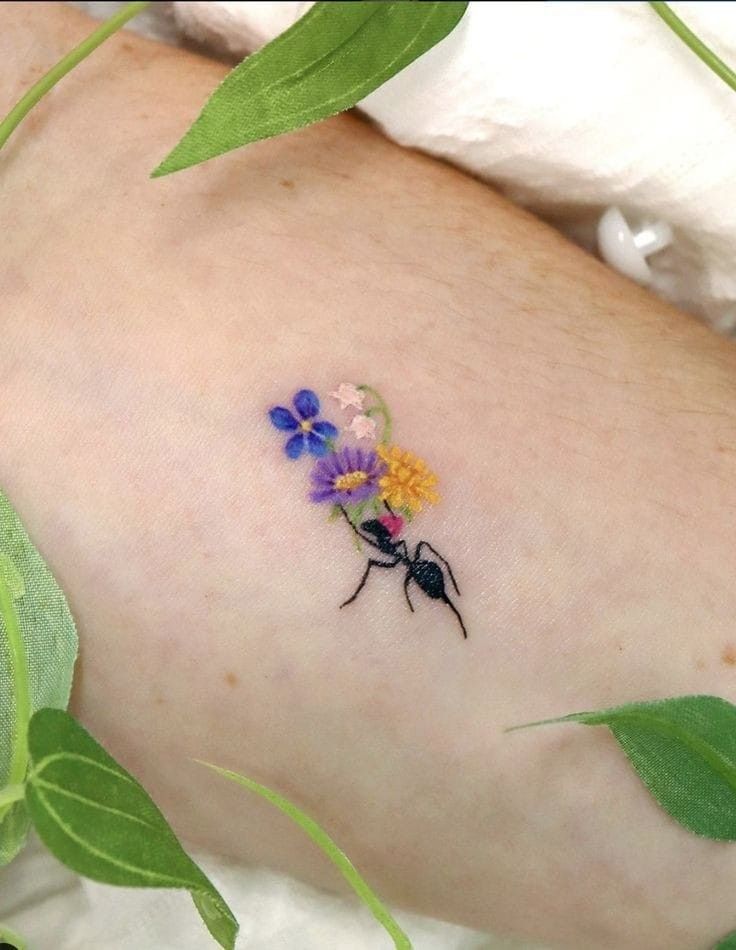 Now this is the kind of tiny tattoo that makes people smile. An ant carrying a bouquet feels poetic, funny, and surprisingly tender all at once. It turns an ordinary creature into something romantic, which gives the whole design a lovely storytelling quality. The colorful flowers add softness while the dark little ant keeps the piece grounded, and together they create one of those tiny tattoo ideas that feels both imaginative and deeply human. It is sweet without being sugary, artistic without being loud, and a perfect example of how a small design can still feel full of life.