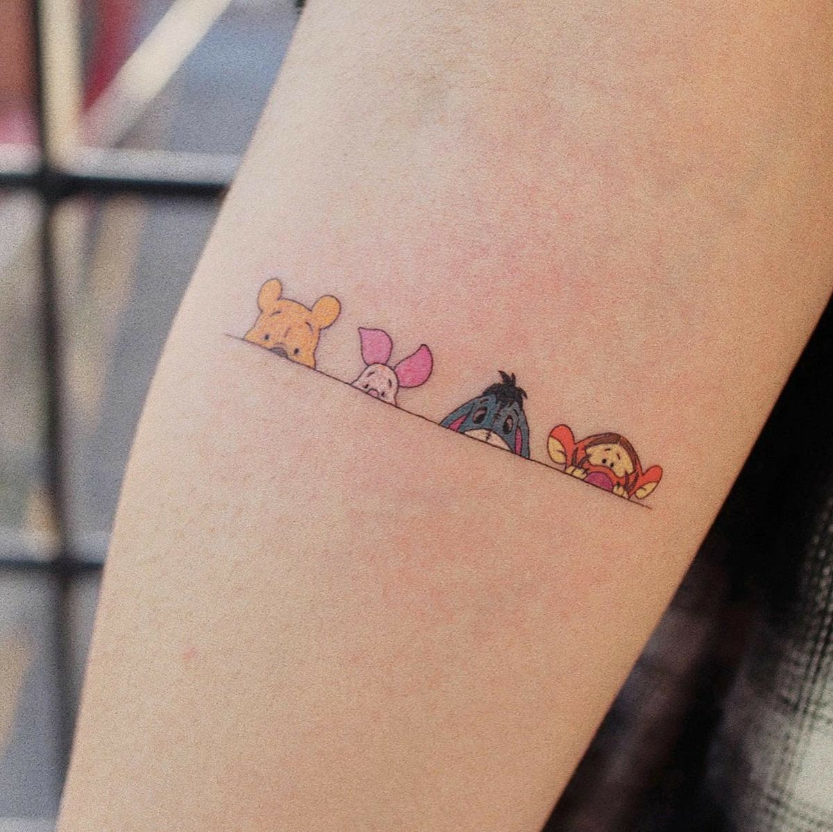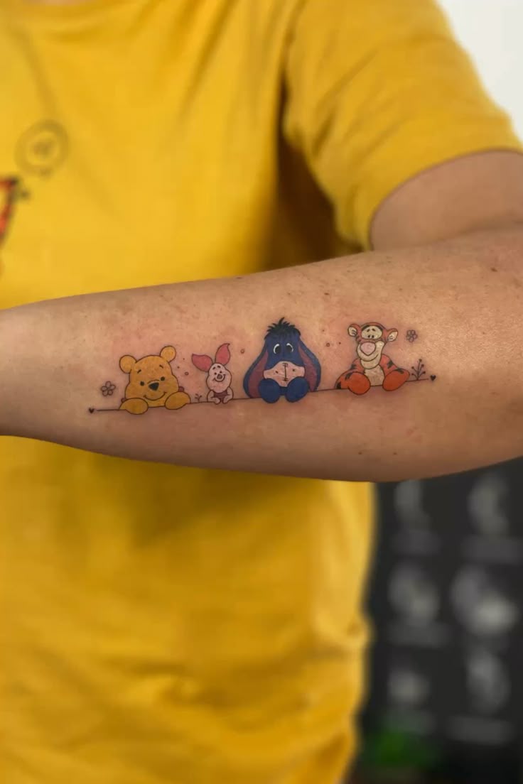 6. Tiny Winnie the Pooh Friends Forearm Tattoo