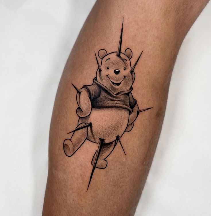 This black and white tattoo is another instance where Pooh appears to be bursting through your skin, but with bold graphic lines shooting off all around his body. He’s achieved this with dotwork shading, which provides this cuddly character with a soft plush texture to get the best of both worlds: a caressable creature and an edgy showpiece. It’s a clever play on traditional Winnie the Pooh tattoo designs that is great if you adore the character but are looking for something a bit more mature and surprising.