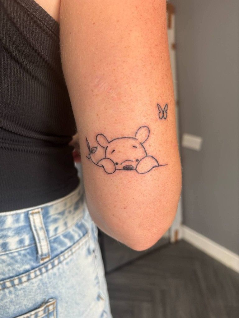 4. Fine Line Winnie the Pooh and Butterfly Tattoo
